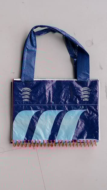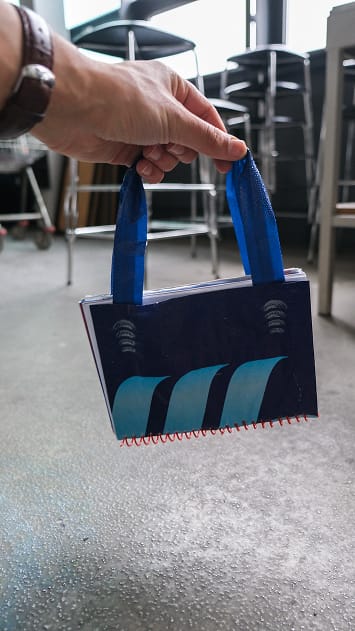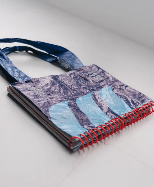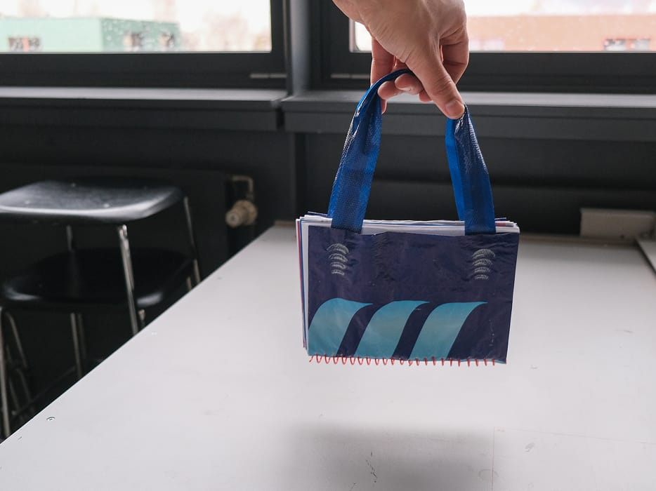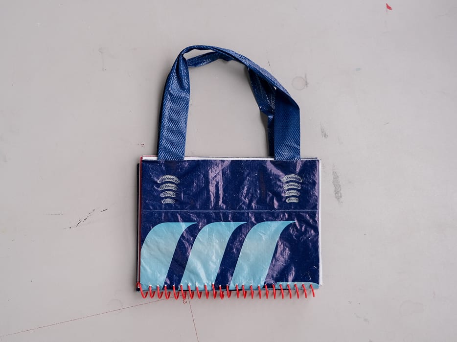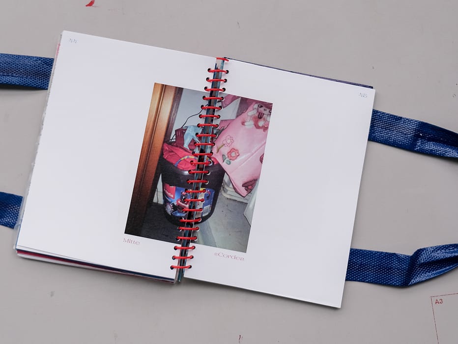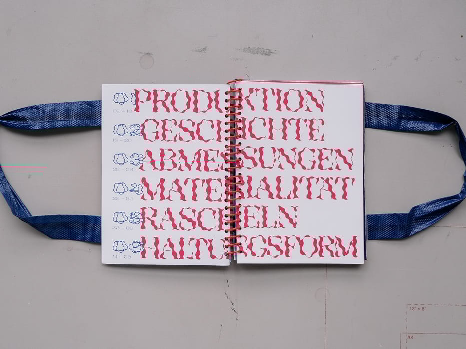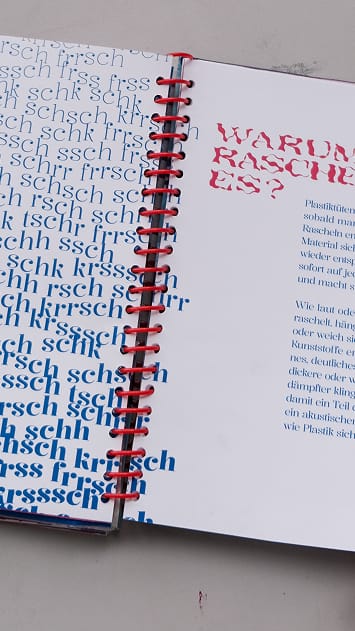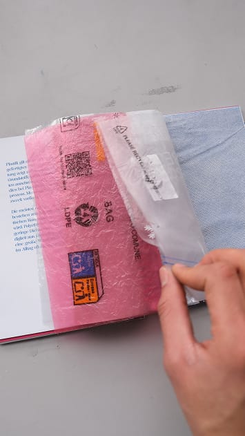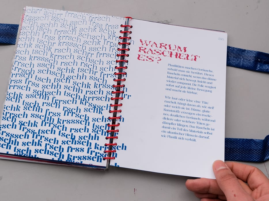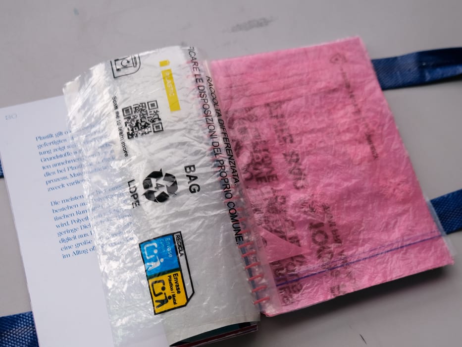 Eine besondere Rolle spielen der Umschlag, der aus einer echten Plastiktüte besteht, sowie die verschiedenen Materialproben im Inneren der Publikation. Zusätzlich ist eine kleine Fotoserie entstanden, die das individuelle Aufbewahrungsverhalten im Umgang mit Plastiktüten untersucht und dokumentiert.