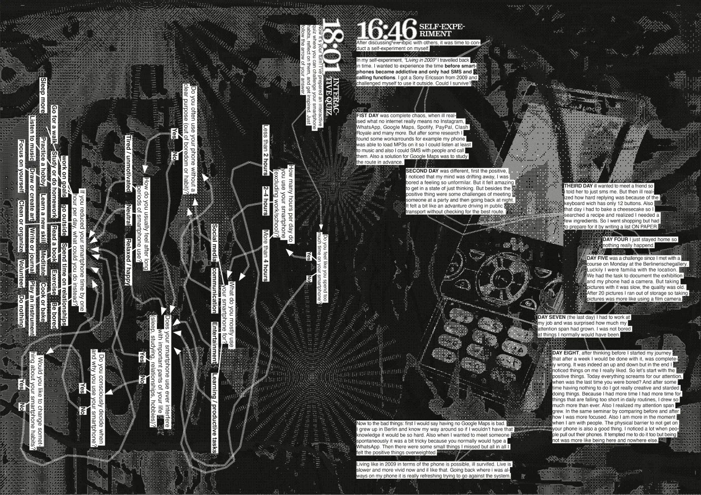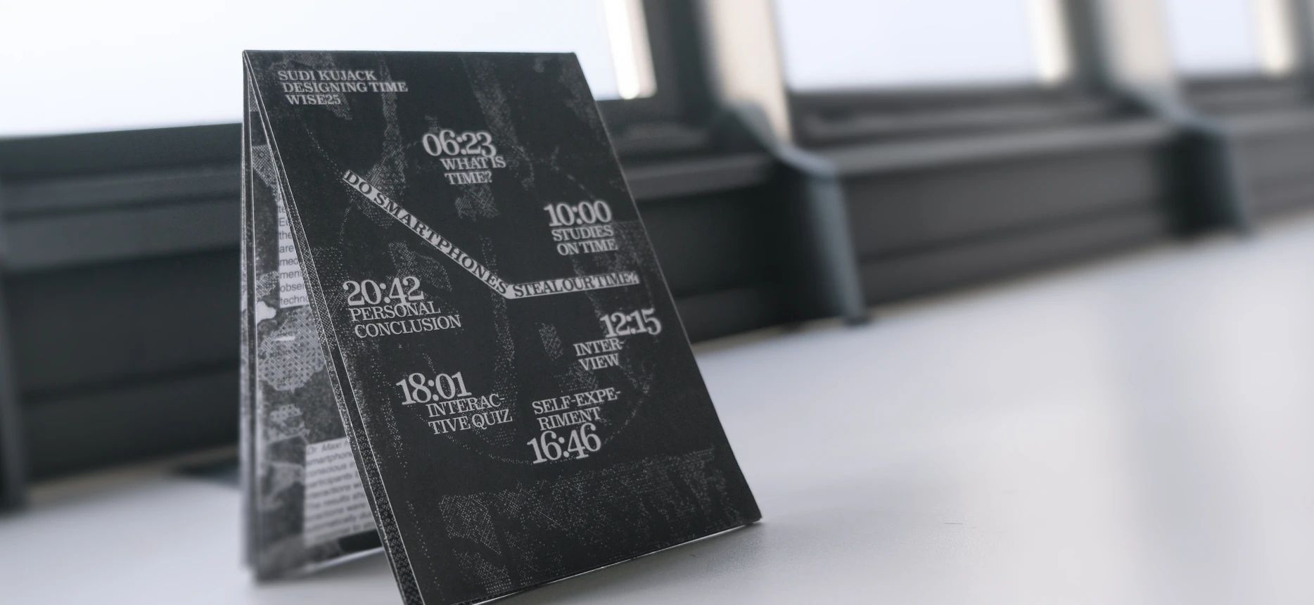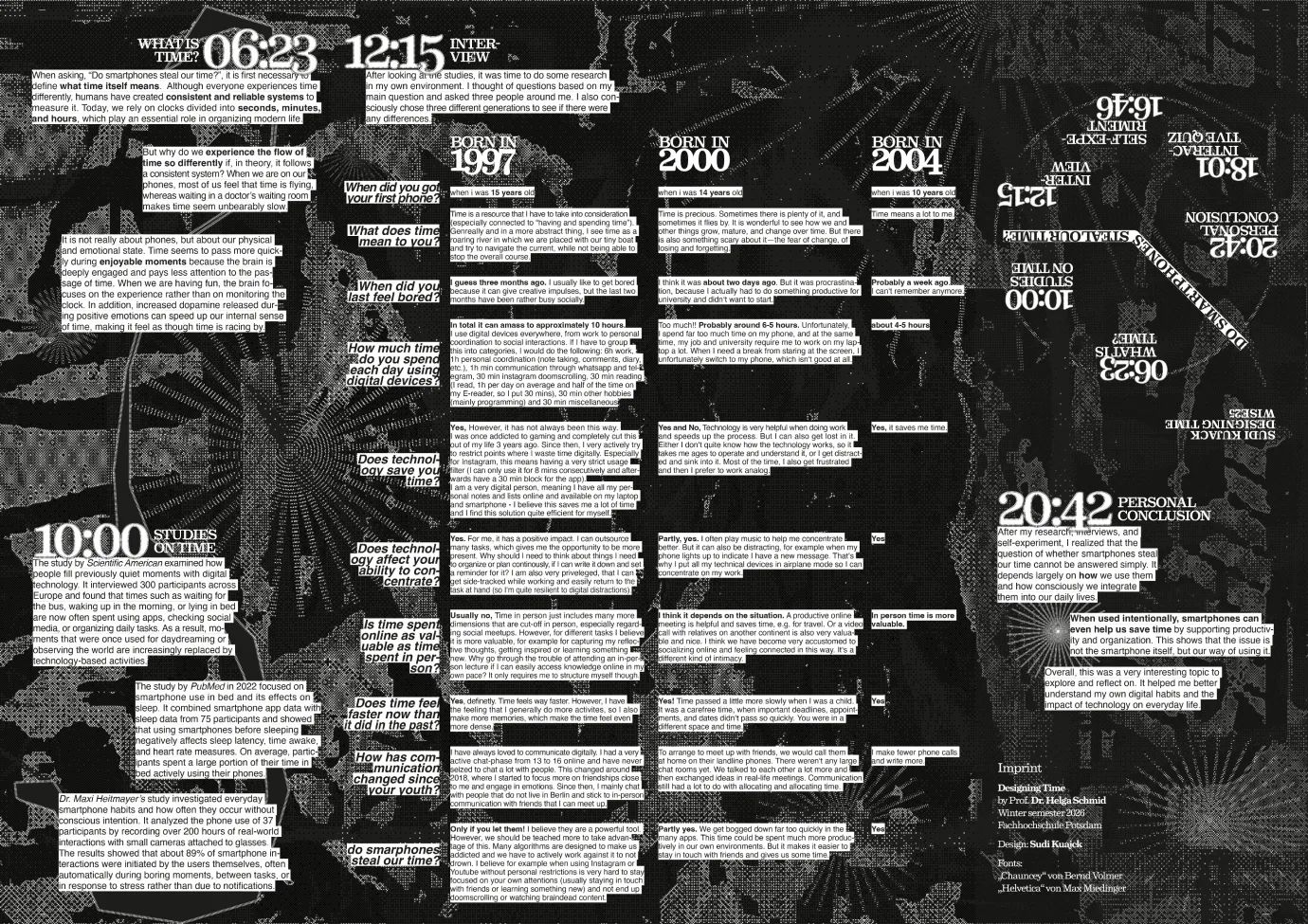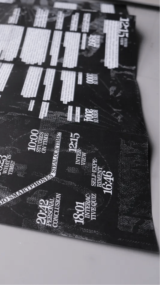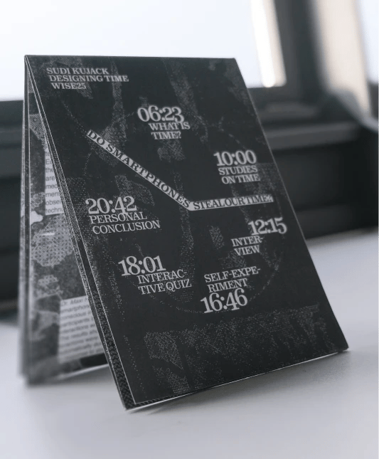 Dieser Flyer ist im Rahmen meines Studiums in einem Seminar entstanden und beschäftigt sich mit der Frage, ob Smartphones uns Zeit stehlen. Mithilfe verschiedener Methoden habe ich versucht, diese Fragestellung zu untersuchen und zu beantworten. Das Narrativ ist als Storytelling-Geschichte aufgebaut Die einzelnen Inhalte führen schrittweise durch verschiedene Aspekte der Thematik und laden dazu ein, das eigene Nutzungsverhalten zu reflektieren.