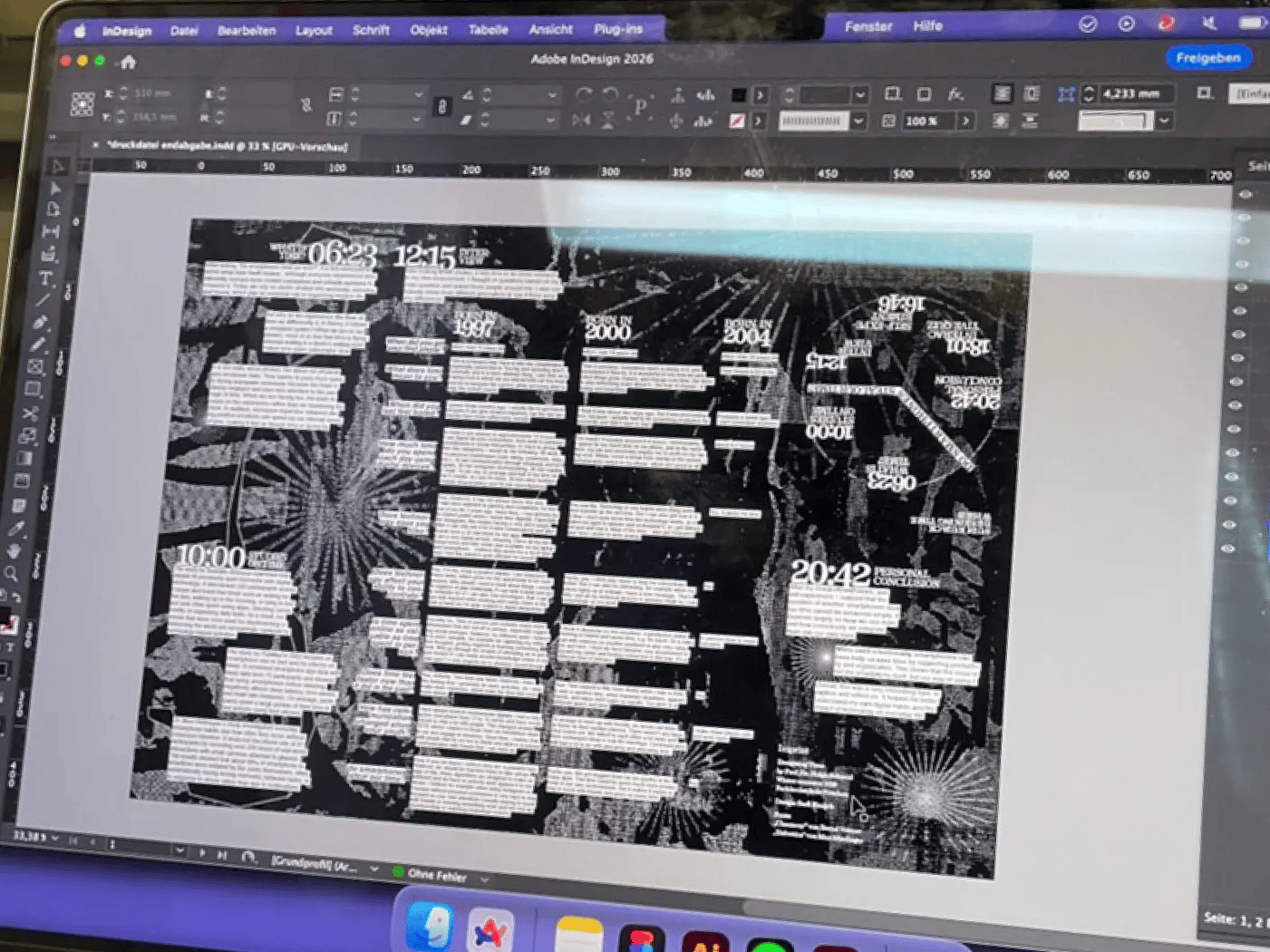 Auch das Layout erforderte ein hohes Maß an konzeptionellem Arbeiten. Da sich faltbare Formate in meinem Layoutprogramm nicht realitätsgetreu simulieren lassen, habe ich die einzelnen Schritte eigenständig vorausgedacht und gestalterisch umgesetzt.